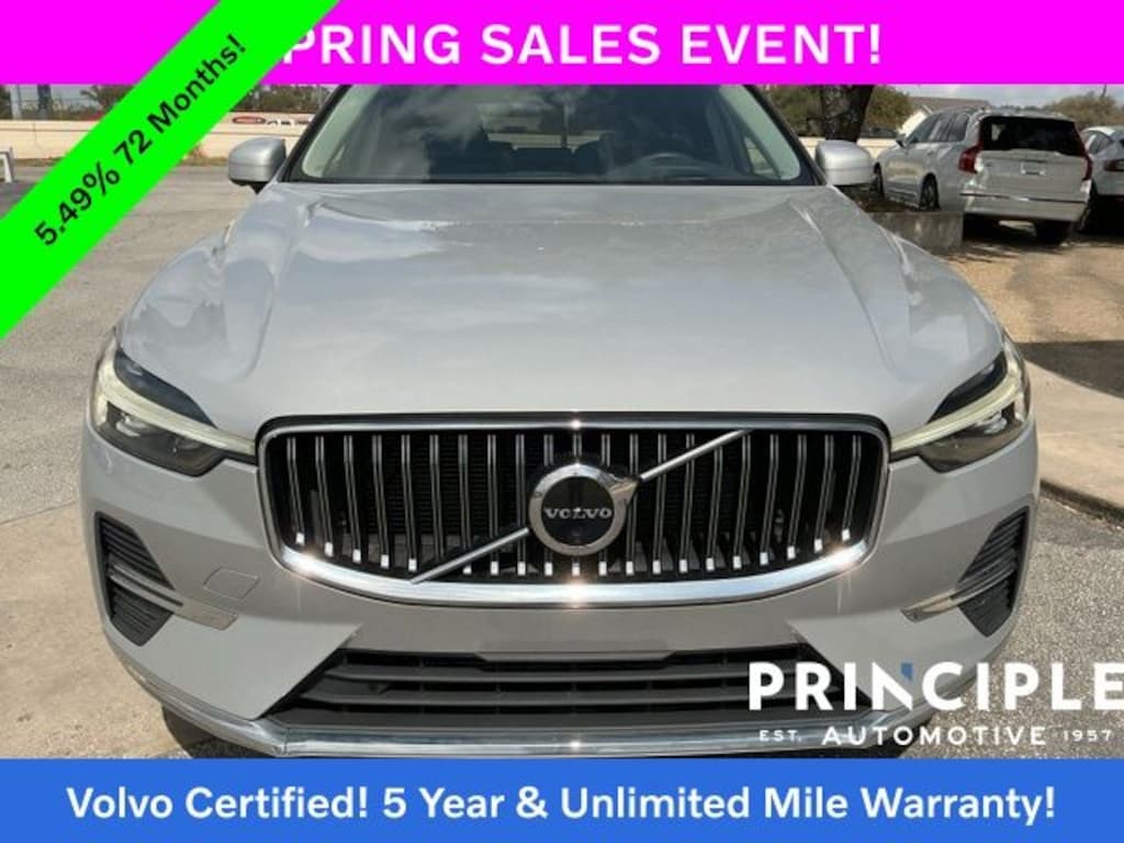 Discover refined Scandinavian luxury and advanced performance in this 2023 Volvo XC60 B5 Ultimate Bright Theme with 29528 miles, now available at Principle Volvo Cars San Antonio. This Certified Pre-Owned Volvo XC60 delivers the perfect balance of turbocharged and mild hybrid efficiency, intuitive technology, and signature Volvo safety. As a Volvo Factory Certified vehicle, it includes a total of 5 years of warranty coverage with Unlimited Miles, giving you long term confidence and exceptional value. The Ultimate Bright Theme offers premium features, elevated interior finishes, Google built in infotainment with Google Maps and Google Assistant, a panoramic roof, advanced driver assistance systems, and the comfort and safety innovations that consistently make the Volvo XC60 one of the top rated luxury SUVs in Texas and across the country.